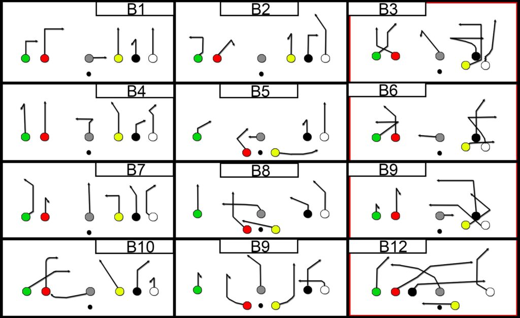 Choose 2-3 formations and 4-5 routes. It’s better to perfect a few plays than to be mediocre at dozens. For young teams, this might be one formation and two plays.